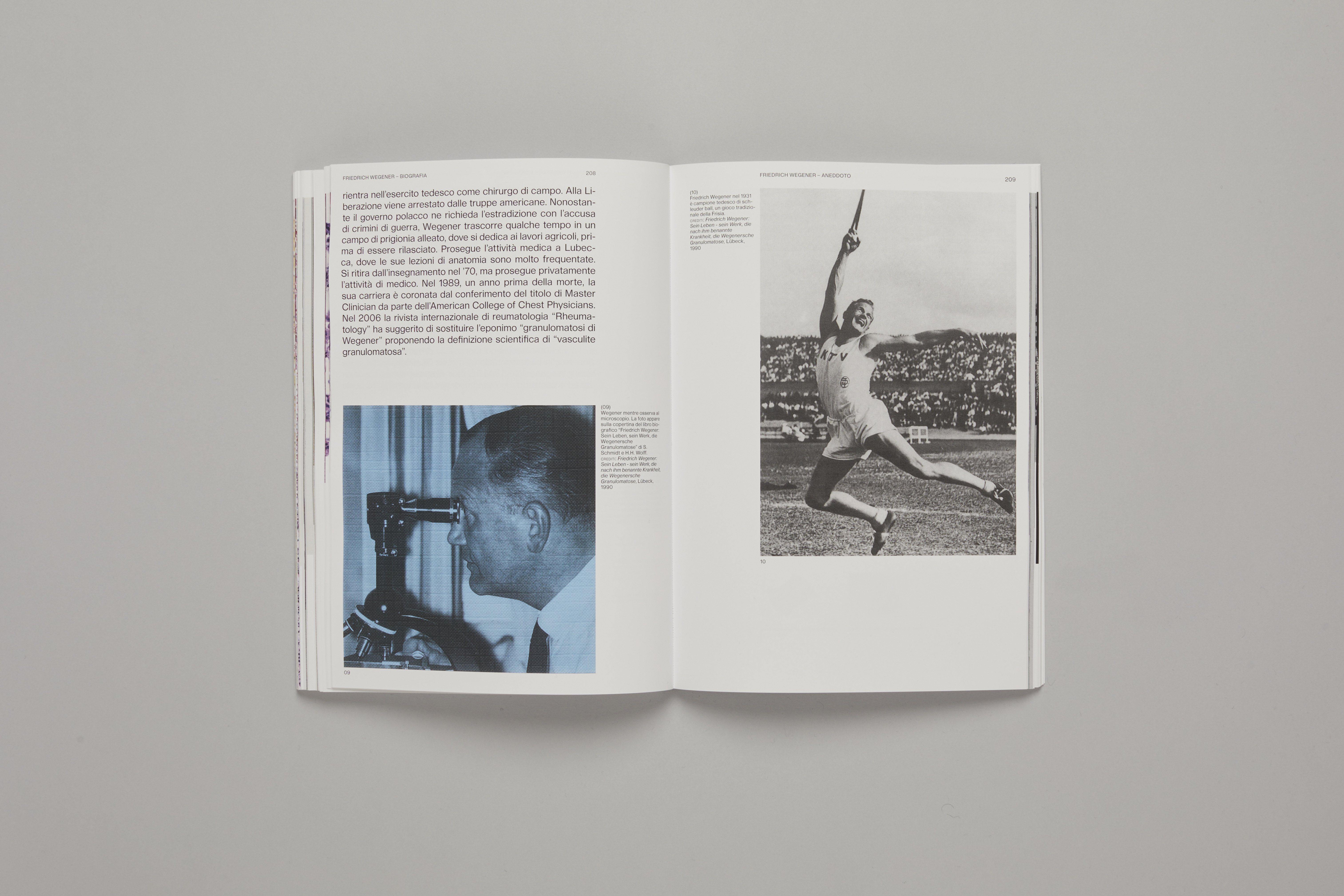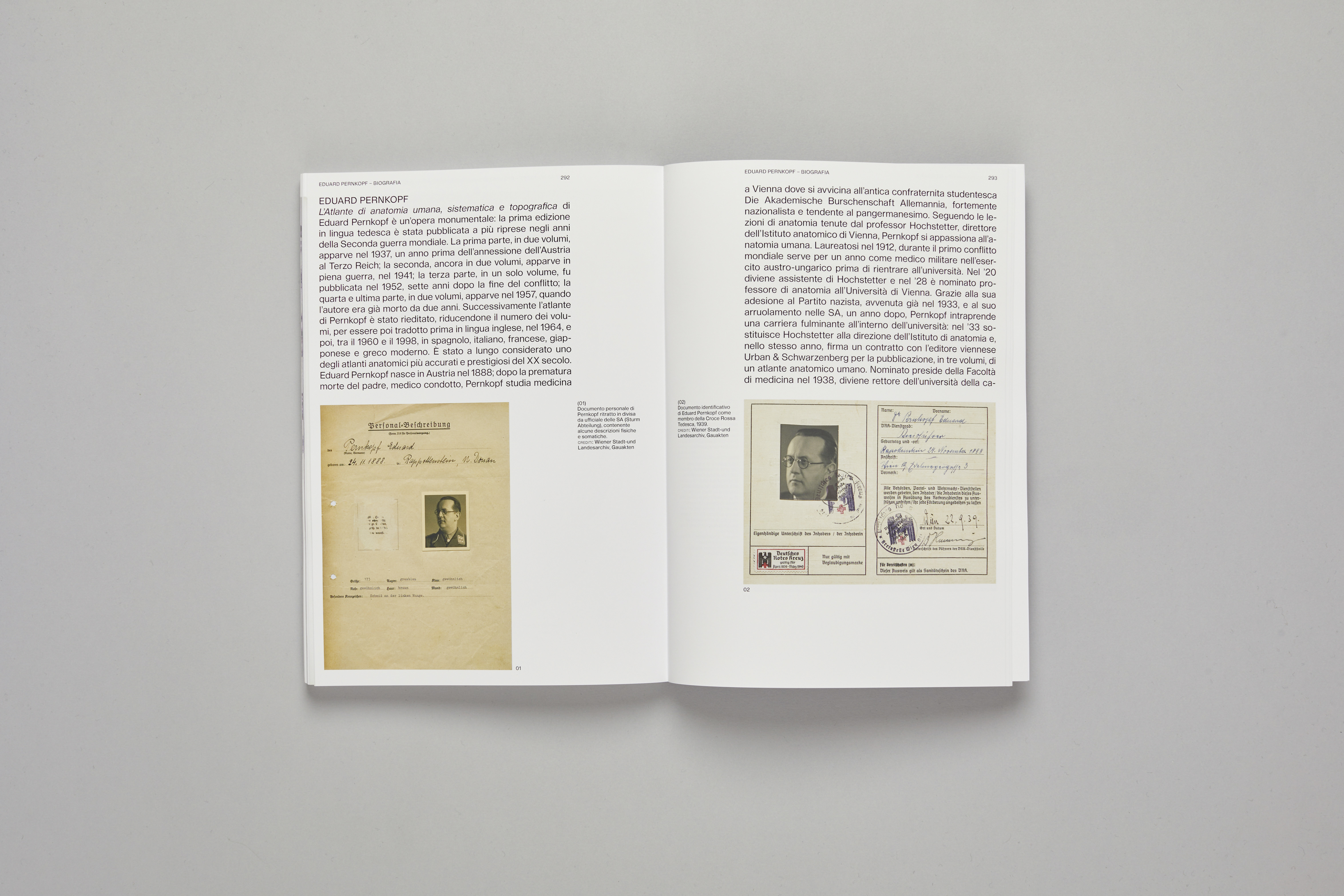 The weight of the word è un esteso e approfondito lavoro di documentazione del fotografo Piero Martinello e dello storico Piero Casentini su casi di eponimia che coinvolgono nove medici e ricercatori nazisti. La raccolta di materiale testuale e visivo proveniente da biblioteche e archivi o da testi medici ancora in uso, come nel caso dell’atlante anatomico di Pernkopf, ci permette di ricostruire la storia personale di questi medici, le loro ricerche, e, in alcuni casi, la damnatio memoriae che è seguita alla condanna del loro operato.