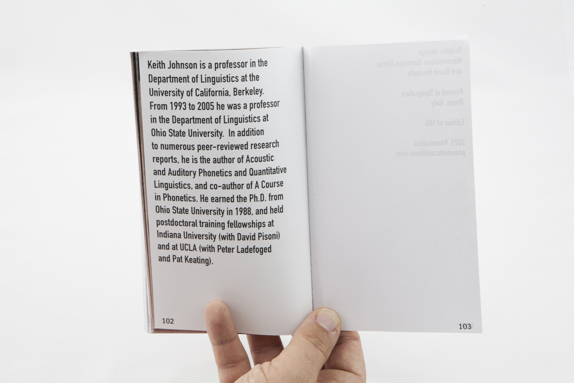 Phonology uses Palatography to detect anatomical mechanisms in producing human speech. In this book, its concrete form is photographic imagery; in particular, photographs of the roof of the mouth touched by the tongue in articulating specific sounds. Pneumatica conducted an interview with Professor Keith Johnson, a prominent scientist in the linguistic field and director of the PhonLab of Berkeley University, about these documents and what they mean. Fascinating on other registers, the subject, form, and use of these documents is restricted to a specialized field of science. The original function and use of visual documents from a specific field changes our perception of them, passing from immediate and natural response, emotionally and semiotically hybrid, to an informed one--material, literal, rational.