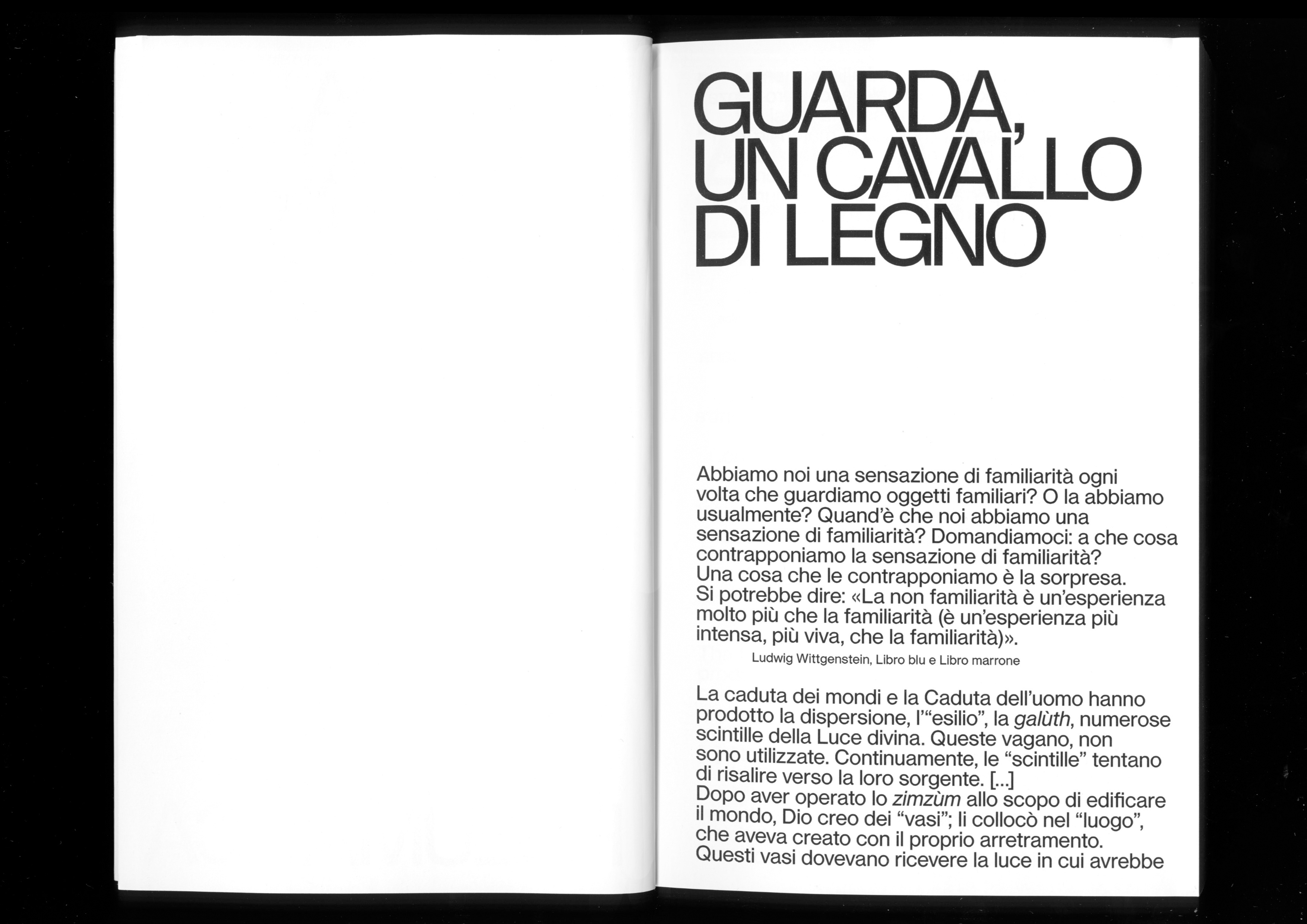 Guarda, un cavallo di legno (Look, a wooden horse) is an attempt to translate a concept from Jewish mysticism, the tiqqun, into a book. According to the Kabbalah, at the time of the Fall, the vessels containing the divine light broke, and their fragments scattered throughout the world. Any man is called to collect them in order to reconstitute the lost unity and return to the Whole, to the original perfection of the world and to the final reunion with God.